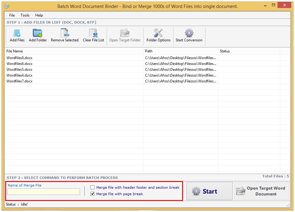 Batch Word Document Binder is a very easy to use tool that can merge many text files into one document. Thus, users can merge an unlimited number of text files, into one document. It supports formats like DOC, dot, DOCX, .dotx, DOCM, dotm, etc. This software has the option of merging headers and footers in files.