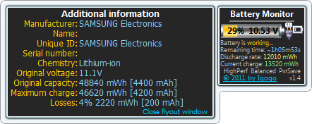 Battery Monitor displays the current status and power of the laptop battery. It will allow you to change the power scheme, save the settings to a file and even customize the appearance of the window - background and text to your requirements.