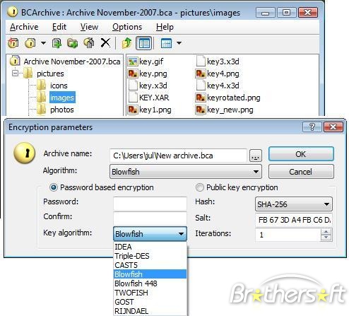 BCArchive compresses specified files and directories using encryption. It uses encryption algorithms such as Blowfish, IDEA, Triple DES, CAST5, SHA-1, MD5, RIPEMD-160 hashing procedures, and asymmetric public or private key algorithms such as RSA and ELGamal/Diffie-Hellman.