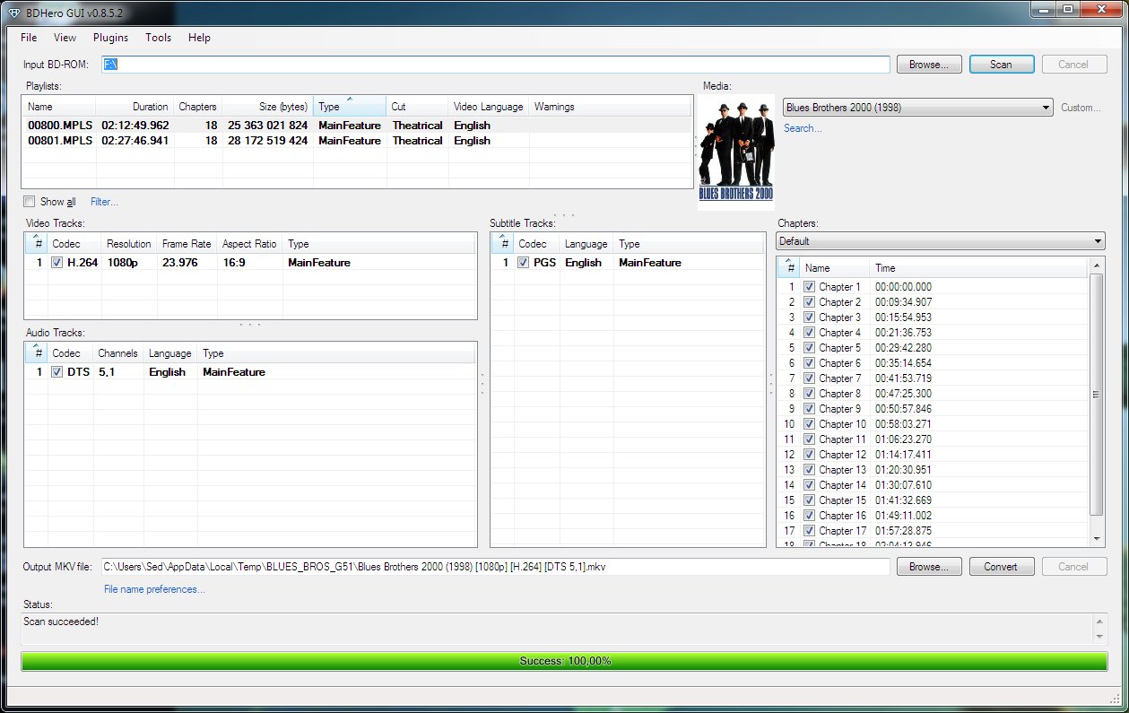 BDHero is an application that provides lossless conversion between Blu-ray and MKV, as well as automatic movie title detection, movie master playlist identification (MPLS file), metadata detection (movie title, release year, poster, chapter titles, etc.). With the application there is also the possibility of customizing the file name, output directory, horizontal resolution and other attributes. In addition to third-party applications (BDInfo, FFmpeg, MKVToolNix), it also relies on online movie databases.