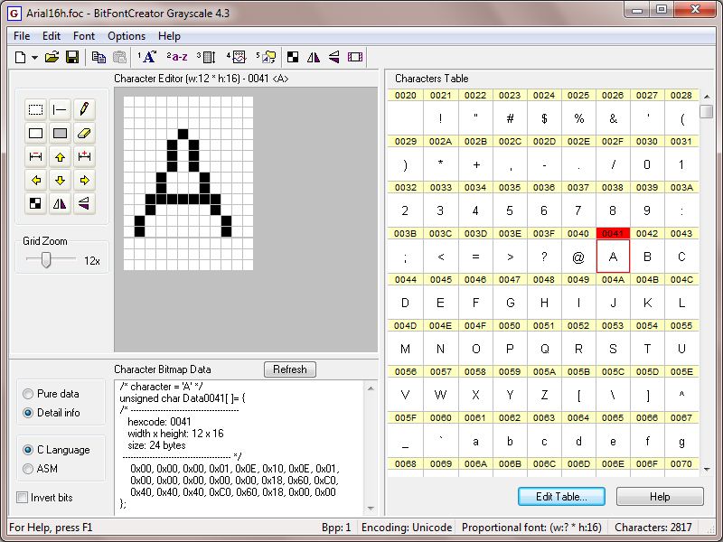 BitFontCreator Grayscale is an intuitive bitmap tool for creating custom fonts. It allows you to design and use smoothed fonts (2-bpp, 4-bpp) for LCD screens or monochrome (1-bpp). The tool includes a number of tools (pencil, eraser, drawing straight lines, borders, etc.). It supports ASCII+ISO8859V and Unicode encoding. It offers functions to export to a .fnt or .fon file, a C file, or a binary or bitmap file.