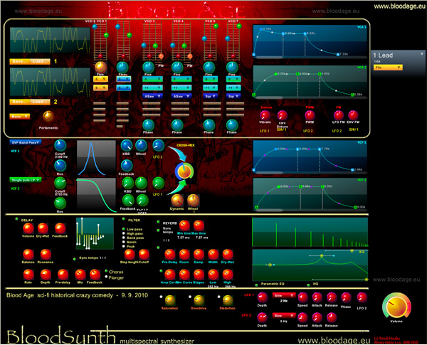Bloody Queen shares most functions and features with Blood synth - except the essential one: radically different sound generators - and therefore sound. Blood Queen has two additive generators that compose the spectrum from individual harmonics (it can do up to 128 of them). They can be used in parallel to layer the spectrum with up to 256 harmonics, and they can also be used to modulate each other's frequencies. Spectra, as well as envelopes, filters and other key parameters are set up in a completely intuitive graphical way, just "draw" them with the mouse. Also, you can just click on a large part of the apparent labels and turn them into toggles, little toys will find dozens and dozens of parameters that most other tools won't let you access at all. By combining the two generators and filtering them differently and using separate envelopes, unique sounds can be modeled, brilliant for organ sounds, metal intermodulation, etc. The Bloody Queen is close in character to, say, the legendary Kawai K-5000.