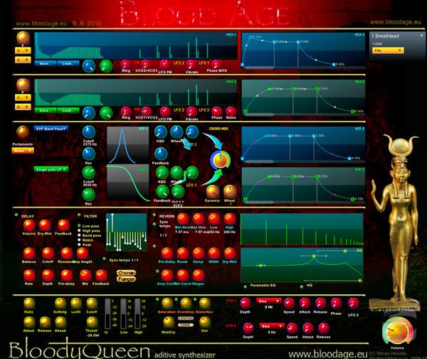 Bloody Queen shares most of its functions and features with Blood synth - except the essential one: they definitely differ in sound generators...hence the sound. Blood Queen has two additive generators, which compose the modula spectrum from individual harmonics (it can do up to 128 of those). They can also be used in parallel to layer the spectrum up to 256 harmonics and can be used to cross-frequency .