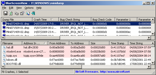 BlueScreenView will scan all dump files created during blue screen display when pc crashes. It shows file name, date and time error code and other parameters. This will help to detect the causes of computer crash.