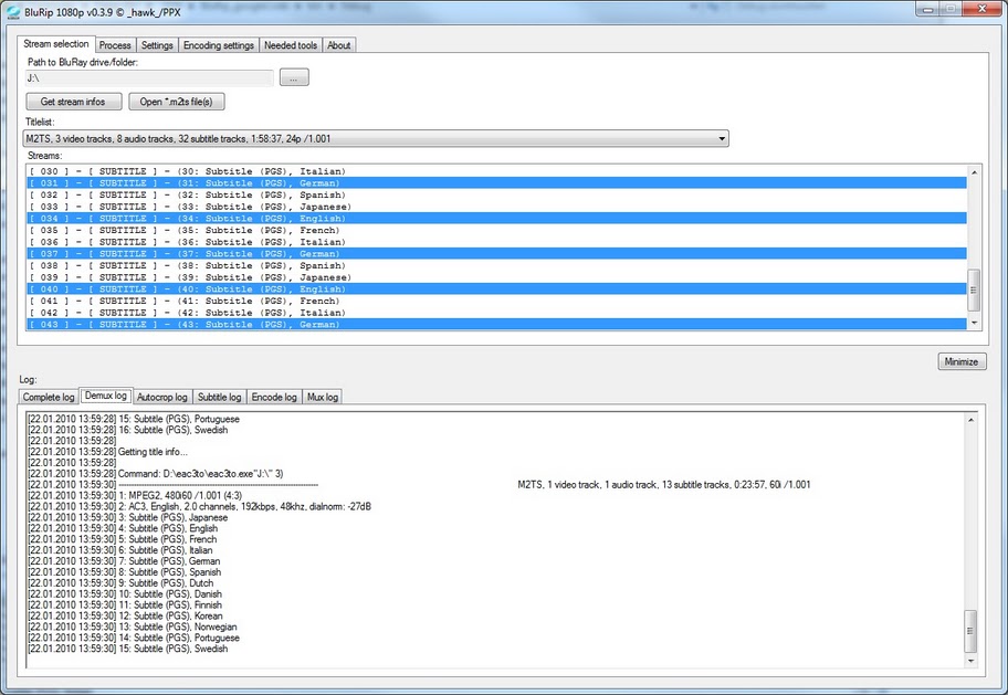 BluRip is a tool for converting BluRay videos to mkv format. It supports audio tracks and subtitles. This tool requires several applications: aviSynth, eac3to, Haali Media Splitter, x264 Video Codec.