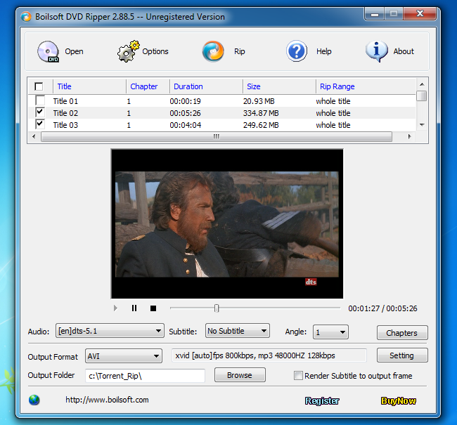Boilsoft DVD Ripper gives you the option to select the DVD titles you want to export to your computer. In addition, you can make subtitle edits or select the output file format such as AVI, WMW, iPod MP4, PSP MP4, VCD, SVCD, DVD or RAW VOB.