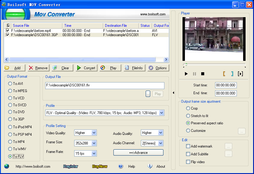 You can preview the source file, set the video to be cropped by start and end time, or specify aspect ratio preservation. You can also configure profile settings for audio and video quality, channels, frame rate, frame rate, size, codec, bit rate, and sample rate.