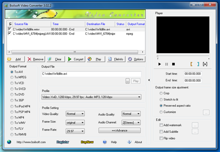 Boilsoft Video Converter is a powerful conversion tool that allows you to convert all popular video file formats to AVI, MPEG, VCD, SVCD, DVD, 3GP, iPod MP4, PSP MP4, FLV format. This conversion will make your video play on iPod, iPhone, iTouch, PSP, PS3, and other digital multimedia devices.