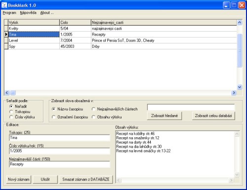 This program is to help you navigate through your collection of various publications. It allows you to save the name of a publication (e.g. a journal), its designation (e.g. order in year), its most interesting articles and its complete contents. It is easy to search and edit records in the database. The program also allows you to export the data for possible backup.