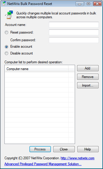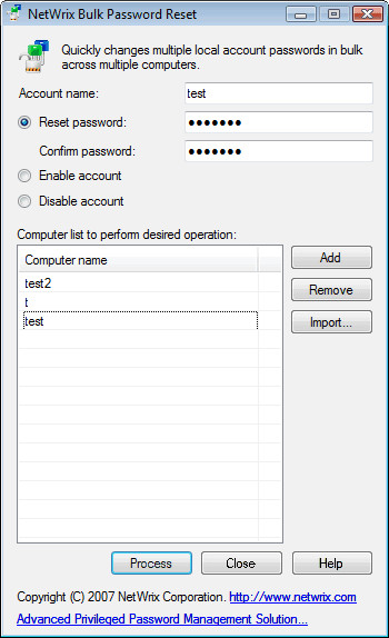 Netwrix Bulk Password Reset is a free tool that allows you to reset local administrator passwords and local user account passwords on multiple workstations at once to better secure your Windows servers. Plus, the quick password reset allows you to change local administrator passwords on multiple computers and servers remotely without having to log in.