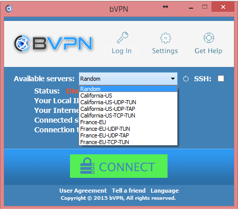 bVPN is a tool you can use to connect to a virtual private network (VPN server) and use the Internet under a different IP address, so you can use it completely anonymously. The tool uses various VPN servers around the world, also supports connection via SSH tunneling and allows you to specify a custom port for this service. All settings can be saved as a WMS file.