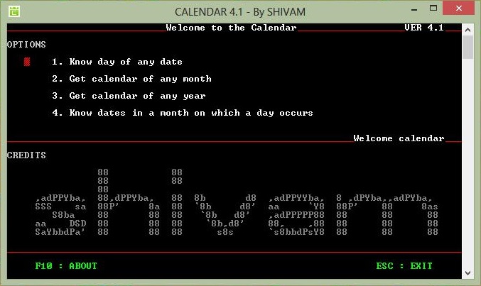 C-CPP Calendar is a command line application that acts as a calendar to record various events. It can work with Gregorian calendar dates from 1753 to 9999. It displays a monthly calendar formatted exactly the same as in graphical applications. The program also provides the creation of a user account that is password protected.