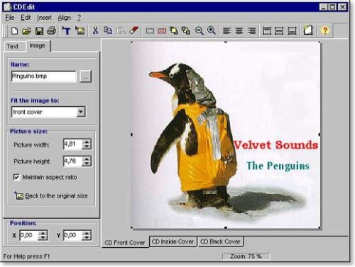 CDEdit is a handy utility created to create CD-Audio, CD-Rom and CD-RW covers. CDEdit has simple controls which guarantees easy and fast creation of these covers. It allows you to insert images and text. You can then print the created covers.