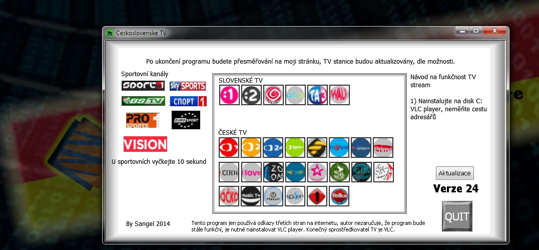 Czechoslovak TV makes it easy for you to stream free-to-air TV over the Internet. It contains the basic program offer of Czech and Slovak TV stations. You will appreciate that it does not contain any advertising, but only links to the author's page. In addition to the aforementioned offer, it also contains several sports programmes. You must have VLC player installed for the program to work properly.