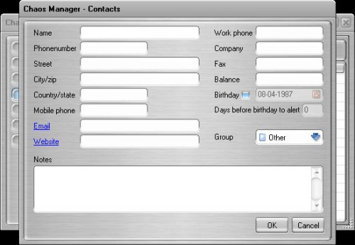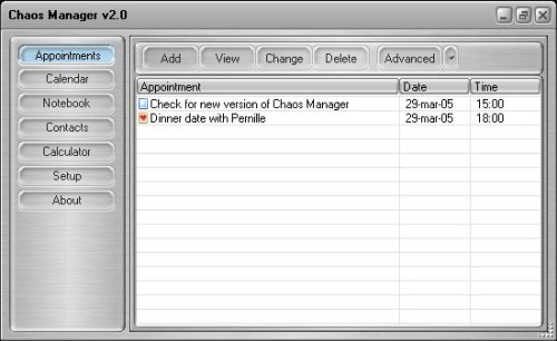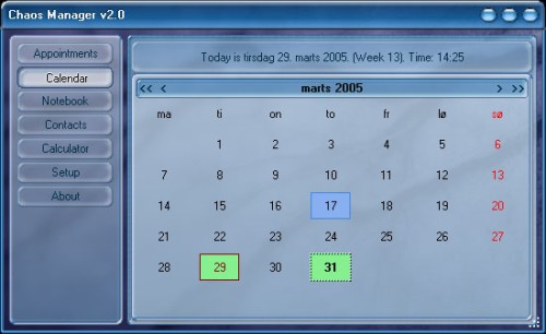 Chaos Manager includes a calendar, notepad, calculator, contacts and events list.