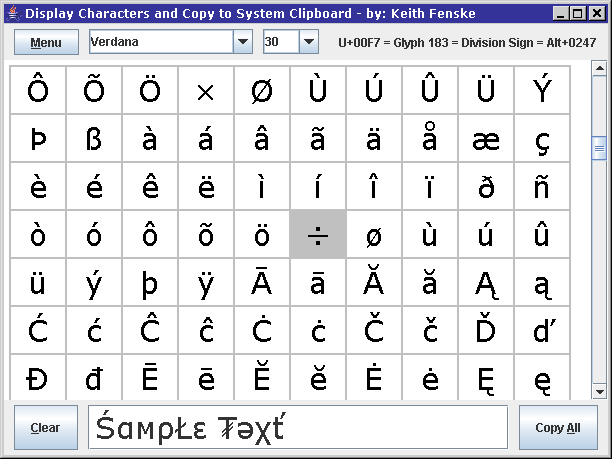 Tool for easily displaying unicode characters or glyphs in the selected font and copying selected characters using the clipboard.