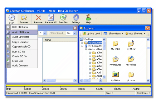 Cheetah CD Burner provides an easy-to-use interface for burning CD-R and CD-RW discs. It can burn bootable CDs, ISO files, audio CDs from MP3, MP2, WMA, WAV, AVI and OGG files and rip audio CDs.