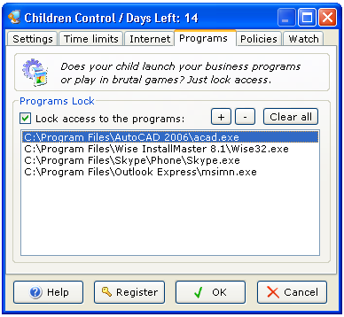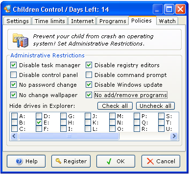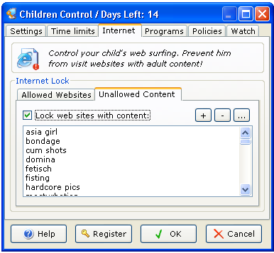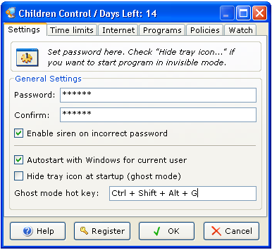 Children Control allows you to control access to your computer, websites, various programs and system functions. This handy tool is a great choice for all parents who do not want their children to spend hours on the computer playing games, surfing the Internet and inappropriate websites (violence, sex, drugs,...) and accessing certain programs and system settings. This program can be made invisible and its configuration can be protected by a password you specify.