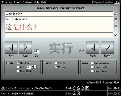 This program is an aid to learning Chinese. You create a new lesson, insert new words and sentences. Then you can choose to have the program show you only the Chinese characters and you have to translate them correctly or vice versa; or let the computer read the words and you repeat them after it. You can even print out the Chinese phrases and learn them whenever you have time.