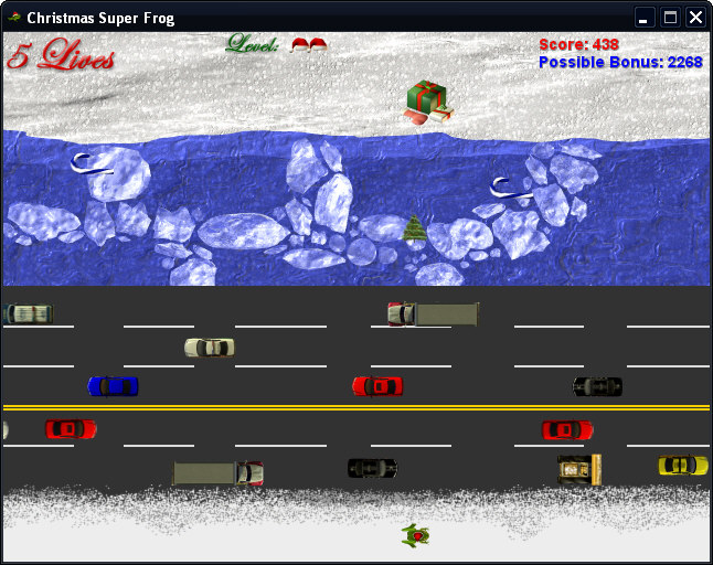 Christmas Super Frog is a very nice arcade game where a dressed up Frog helps Santa collect presents. He has to cross a busy road in his search. There are a total of 5 (attempts) lives available.