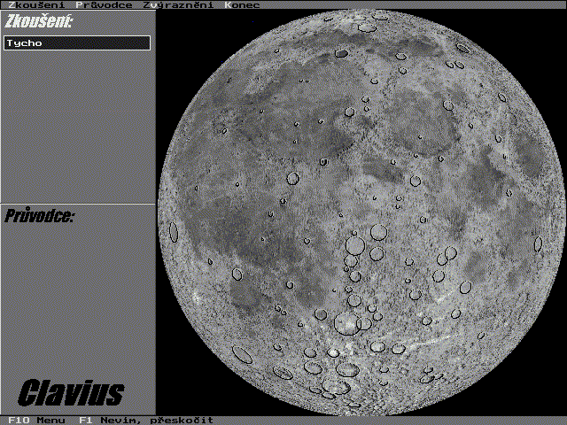 Free astronomy tutorial for DOS (in Czech). It allows you to learn about important formations on the Moon, visible to the naked eye and with smaller telescopes.