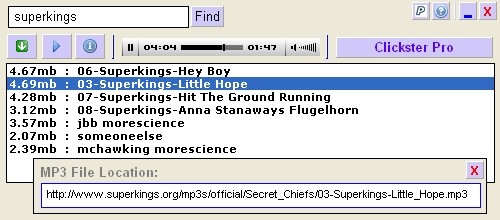 Clickster is a handy application that allows you to search and download mp3 files from the internet. It works on a similar principle to P2P networks, but specializes only in searching for MP3 music. The program searches for music according to the keywords you enter.