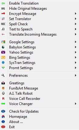 Clownfish for Skype is an online translator for all your Skype messages. Now you can write in your native language and the recipient will receive the message translated into the language of the counterpart. It has a built-in spell checker compatible with the OpenOffice database. It includes text-to-speech support for all incoming messages, the ability to send predefined ASCII characters and emoticons.