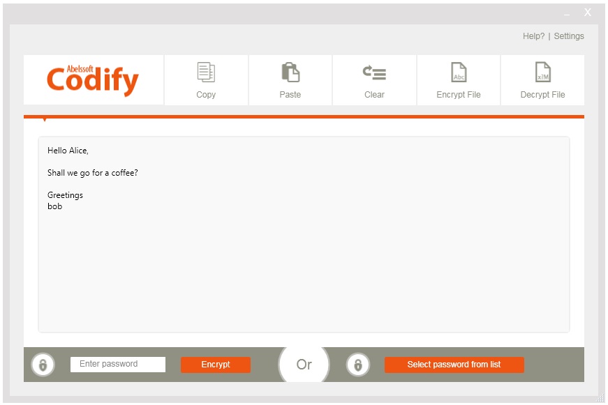 Codify lets you create, edit and encrypt text quickly and easily. The recipient will only need the free version of Codify and a password to decrypt the message. Codify uses the AES-256 algorithm to store the password securely. The use of this algorithm is even allowed to encrypt top secret documents in the United States. Using Codify will secure private and sensitive data or just the contents of your emails.