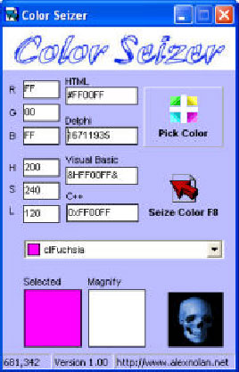 Color Seizer is a utility designed for programmers. With the program, you can select any color on the screen to be displayed in various formats such as HTML, Delphi, Visual Basic, C++, RGB and HSL.