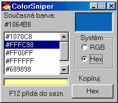 You can copy the color to other programs. ColorSniper supports two color systems, RGB and hexadecimal. You can add a color to a list, where theoretically there can be infinite colors. You can copy the selected color to the clipboard. Hexadecimal is useful for designing WWW pages and RGB for transferring to graphics programs (since programs have separate colors, red/green/blue are copied separately).