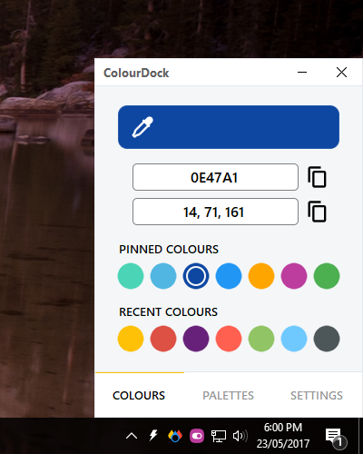 ColourDock is a tool that captures specific colours (HEX) or RGB using a cursor and copies them to the system clipboard. The seven most recently detected colors are displayed in the main part of the window. The tool also includes a color menu based on the Material Design hue set. It is also possible to copy the hexadecimal code of a color, as well as the code of similar shades. The settings can then be switched to laptop mode or multi-monitor (screen) mode.