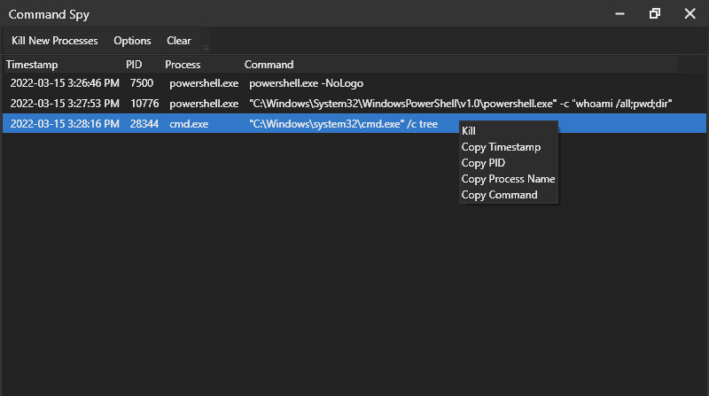 Command Spy is a tool that allows you to keep track of new processes that start on your computer. It shows you the commands, including arguments and parameters, that were run when the process started. You can also filter specific executables or automatically terminate new processes.