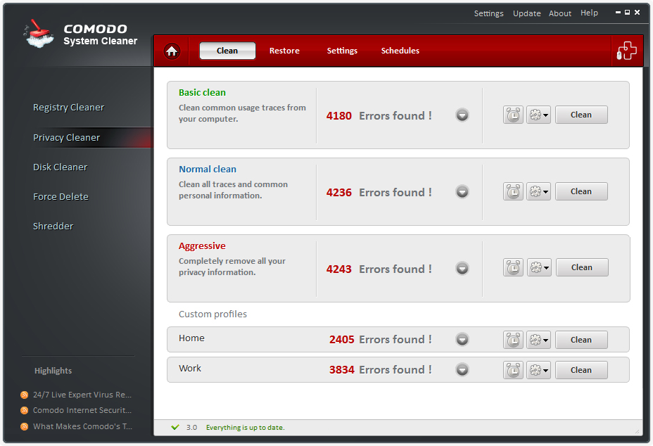 Comodo System-Cleaner a tool to clean files, registry, disk including unique features.