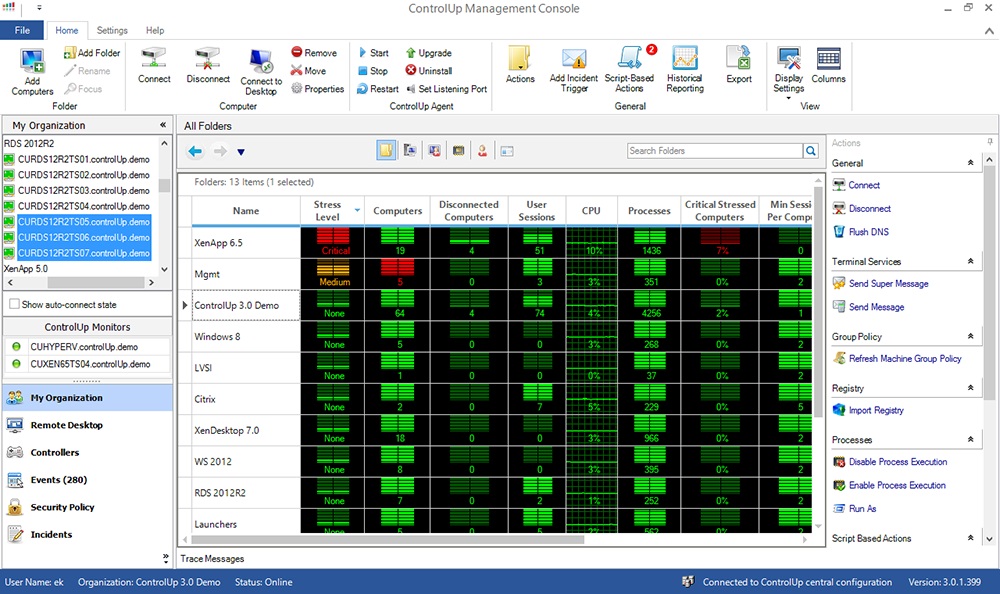 ControlUp is a program that provides you with comprehensive information about users, network connections and processes. ControlUp provides real-time monitoring of server room and desktops, providing important information about the performance of managed machines (RDS, VDI stations, regular desktops). It will also take care of identifying and resolving problems quickly (in real time). ControlUp is also equipped with an advanced email notification system, the ability to execute a set of tasks in parallel across multiple computers, a library of management scripts (supports importing custom scripts), and a complete solution for remote control and management of computers. Analysis and storage of all events is also available.