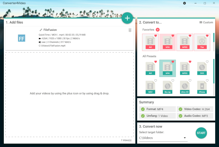 Converter4Video is a tool for converting the most commonly used multimedia video formats, including videos for portable devices. It uses the latest conversion and compression technology to ensure the best quality.It supports all common formats (FLV, WMV, SWF, MPEG, MP4, 3GP, M4V, AVI, MKV, MOV, F4V).