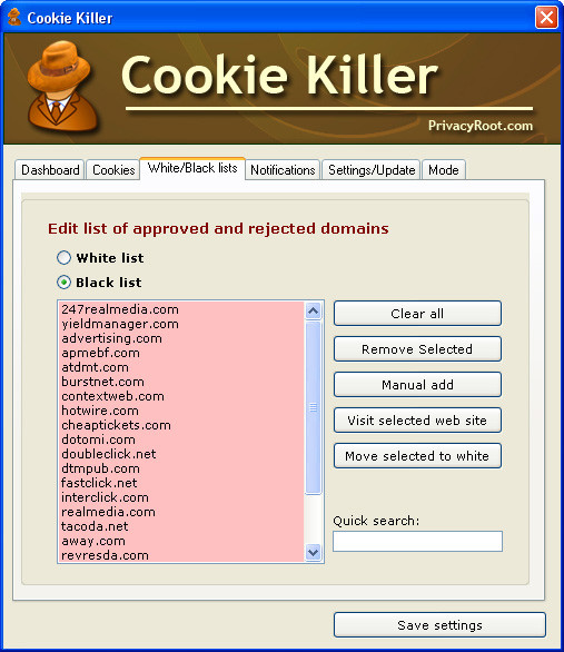 - Cookie Killer monitors cookie storage from all websites you visit.