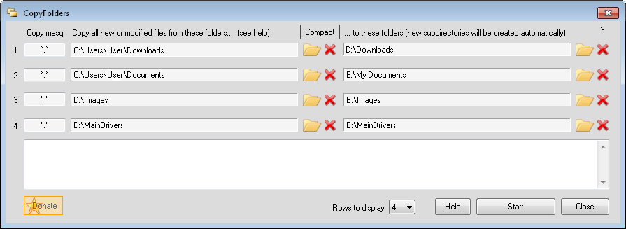CopyFolders is a simple program that copies all new or changed files from one or more original folders to the destination folder. You can choose to display from 1 to 9 origin and destination folders in the program window.