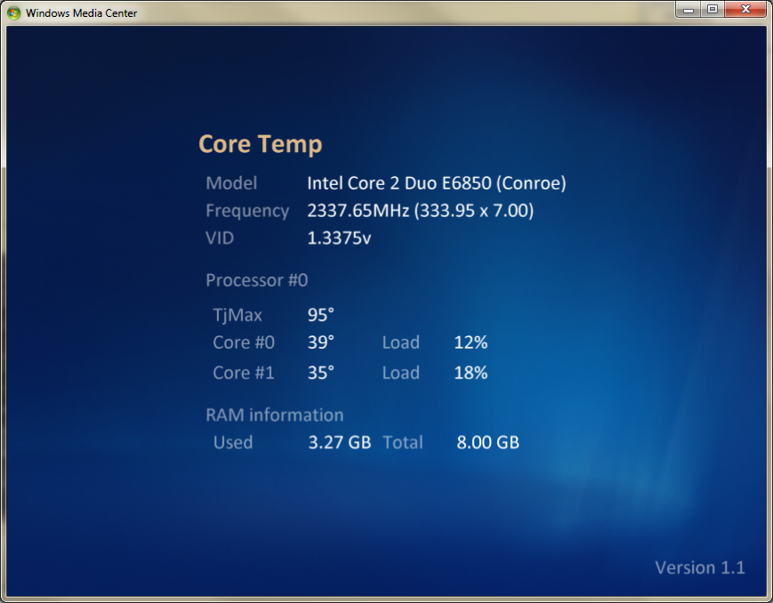 Core Temp MC is a Windows Media Center add-on that allows users to view their CPU status directly from the Windows Media Center user interface.