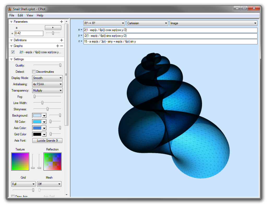 CPlot is software that allows you to plot 2D or 3D graphs of real, complex, parametric and implicit functions as well as vector fields. The software includes real-time animations, intuitive expression syntax as well as user-defined parameters (real numbers, complex numbers, integers) and functions. It also includes rendering modes and specific display configurations (texture, grid, transparency or reflections). Three types of coordinate systems are supported - polar, spherical and cylindrical.