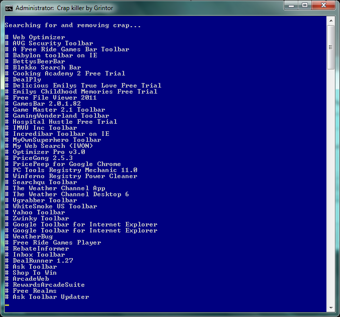 Crap Killer is a script running in a command line environment. It detects and automatically uninstalls software that applications mark as crapware. Crapware are programs that are pre-installed on new computers and have limited usability. They are usually only available in a limited version (you have to pay for the full version) and are difficult to get rid of. For example, toolbars are very common.