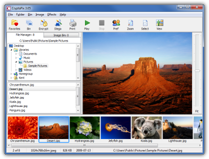 CryptaPix is a program for organizing and encrypting graphic files for Windows. It allows you to manage, print and secure digital photos and downloaded graphic files. It also offers features such as: size adjustment, rotation, cropping, removing red-eye from photos. It can create standalone presentations, encrypt photos from unauthorized access using 256-bit AES encryption algorithm.