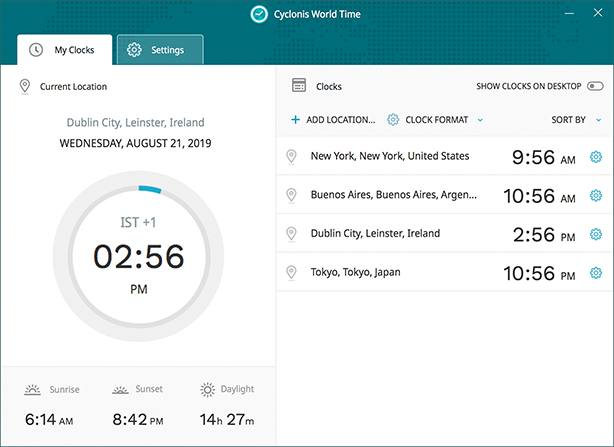 Cyclonis World Time is an easy-to-use tool that can display the current time in different locations around the world, helping you plan your schedule across multiple time zones.