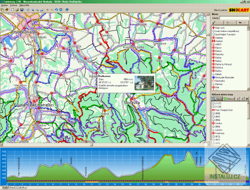 The program provides you with a range of information such as altitude, geographical location, detailed text and photographs for major sites, section lengths, road numbers, cycle route numbers, surface types, hiking and cycling signs. For routes, it is possible to see their total length, elevation, and for prepared routes, the difficulty and type of suitable bicycle. The elevation profile, map, itinerary and statistics can be printed on a printer. The appearance of the elevation profile and map can be modified in various ways via settings. The profile and map can be exported in graphic format or as a web page. The route itinerary can be exported to a CSV file and navigation formats GPX, KML, KMZ, PLT and WPT. The user can keep a log of their routes, including monthly, yearly and total mileage and average speed statistics. Currently, the program contains dozens of maps, located mainly in the Czech and Slovak Republics. The creation of the maps is divided among the so-called administrators, who publish updates of their maps once a year (these can be downloaded free of charge from the program's website).