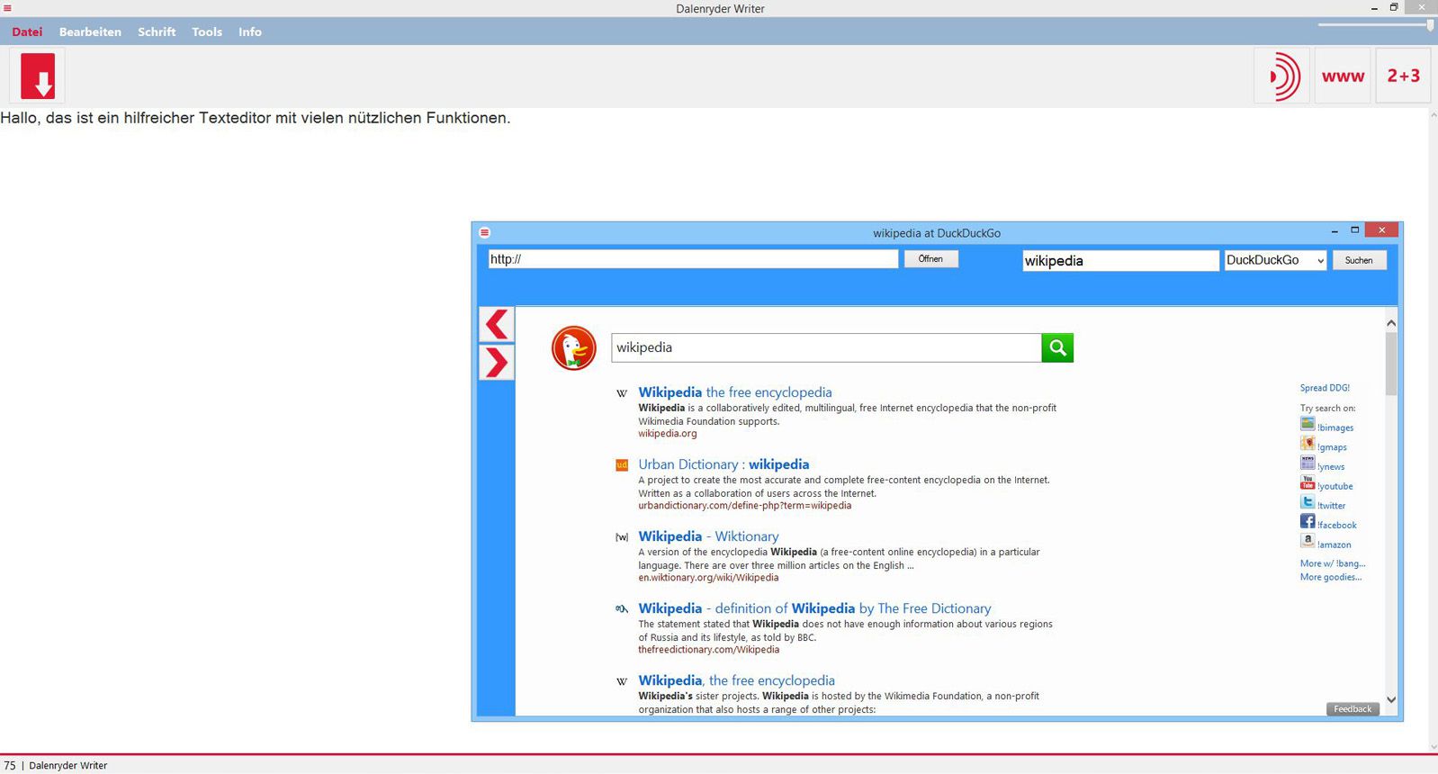Dalenryder Writer is a free software where you can create and edit text. The text can then be saved as .txt, .rtf, .html or xml. Other features include reading text aloud, a calculator, a web browser, and more.