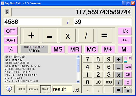 Day Maxi Calc is a clear calculator with large buttons and display, which makes it comfortable to use. It includes classic functions for mathematical calculations. It also offers the option to print or save the result.