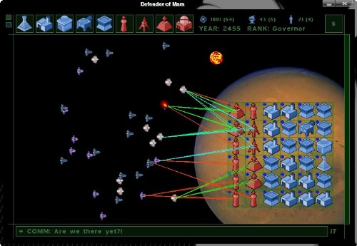 Defender of Mars is a small real-time strategy game written entirely in the Ruby scripting language using the SDL and SGE libraries. The player finds himself in the role of the new governor of a colony on Mars, who must face a hostile invasion from outer space.