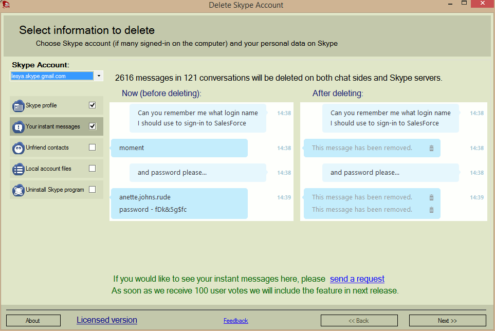 Delete Skype Account is a program that allows you to delete your personal information stored in your Skype cloud account. The program will also allow you to delete chat messages, received files and uninstall the Skype communication program.