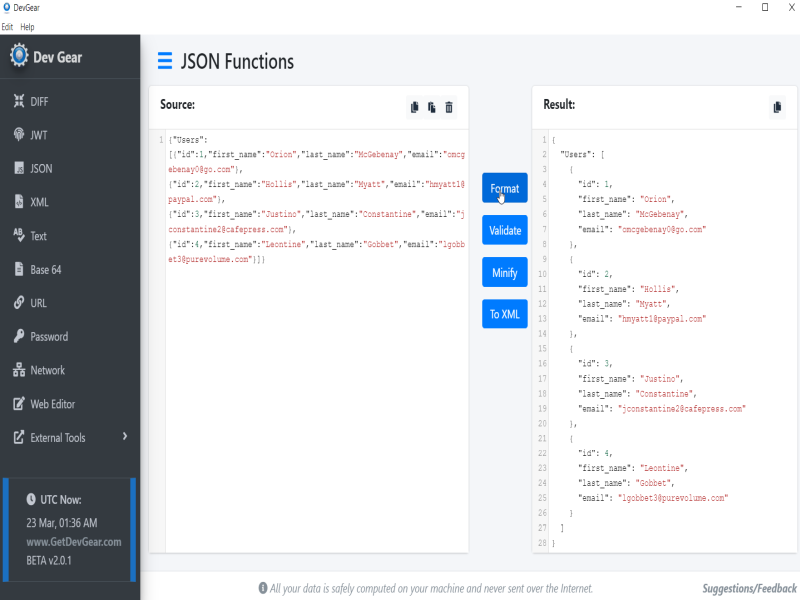 This offline software package offers developers a basic set of tools that are useful for formatting text, identifying differences, encoding or decoding, and much more.