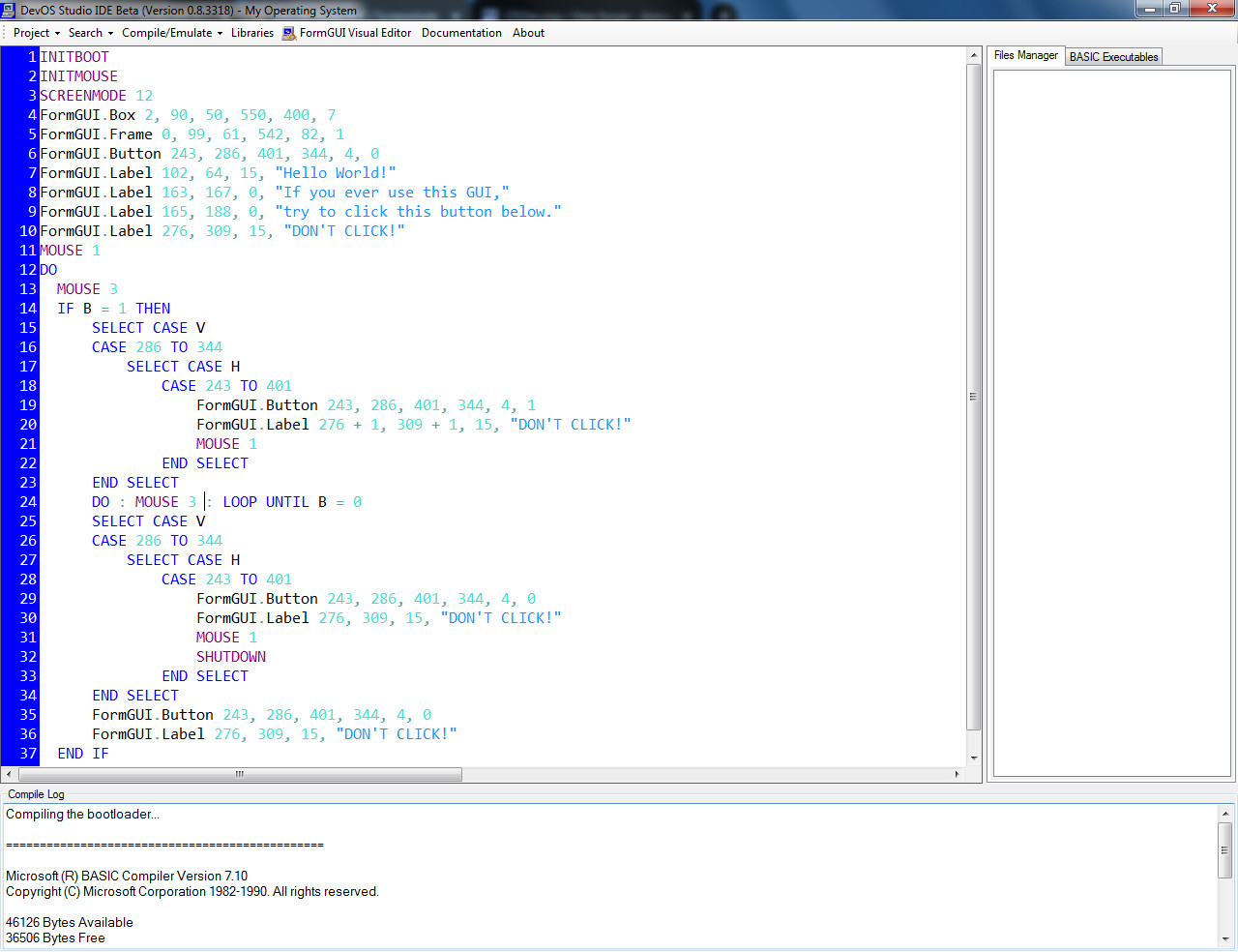 DevOS Studio IDE is a tool for developing and deploying your own operating system. It is an integrated development environment that provides users with all the necessary tools to create their own OS. DevOS Studio IDE uses the DOSBox Emulator to emulate the MS-DOS environment and to compile custom code. The operating system can be deployed on physical hardware or in a virtual machine.