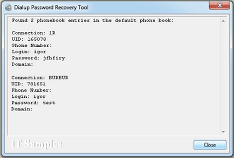 Dialup Password Recovery Tool provides a list of all dial-up and VPN entries on your computer with a display of their login credentials (for example: username, password, phone number and domain).